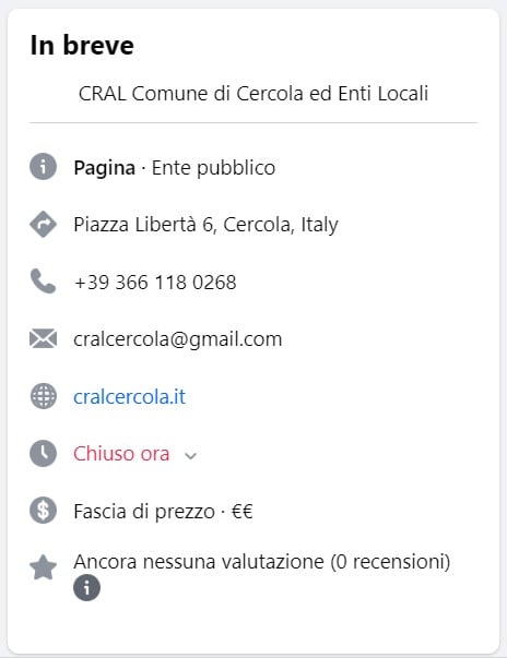 PAGINA FACEBOOK CRAL CERCOLA. INDICATO UTENZA MOBILE DEL DIPENDENTE GIOVANNI RICCARDI. SEDE IN PIAZZA LIBERTA’ AL PALAZZO MUNICIPALE