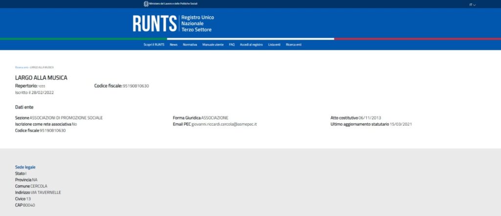 LARGO ALLA MUSICA. ASSOCIAZIONE IL CUI RAPPRESENTANTE LEGALE E’ LA MOGLIE DI GIOVANNI RICCARDI, DIPENDENTE DEL COMUNE DI CERCOLA. LA PEC FORNITA AL RUNTS E’ DELL’ASMEPEC, QUINDI, COMUNALE?