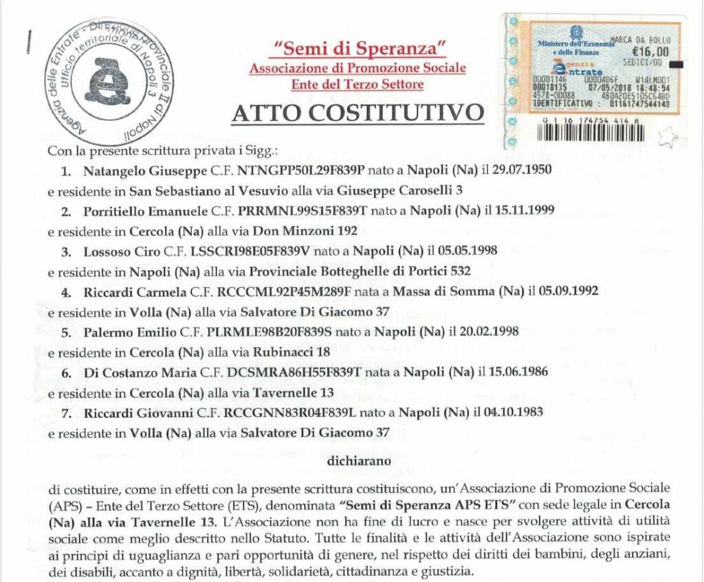ASSOCIAZIONE SEMI DI SPERANZA. UNO DEI FONDATORI E’ IL DIPENDENTE COMUNALE GIOVANNI RICCARDI. LA SEDE LEGALE E’ LA STESSA DI QUELLA DI LARGO ALLA MUSICA.