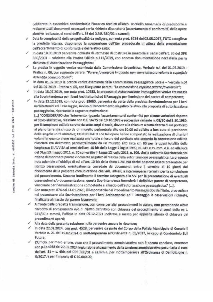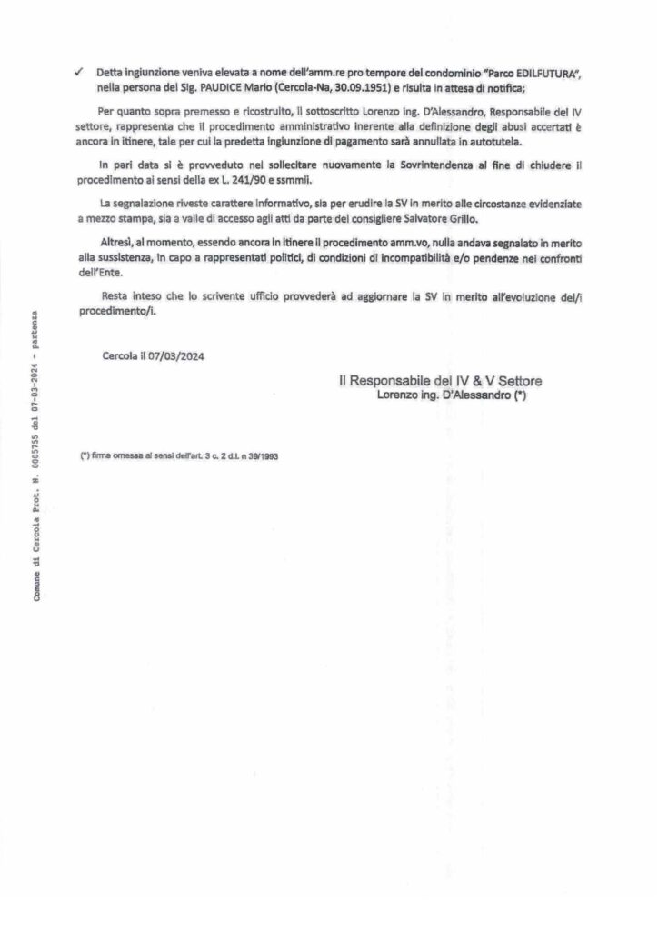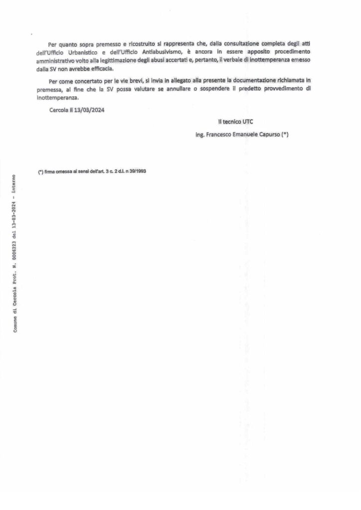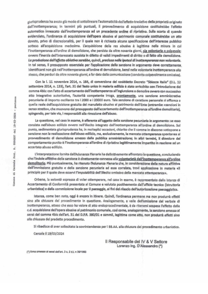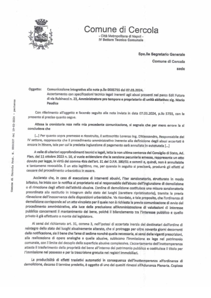 IMBARAZZANTI NOTE E PROVVEDIMENTI DELL’UTC NELL’ULTIMO MESE. LA POLIZIA MUNICIPALE RESPINSE EROICAMENTE LE PRESSIONI DELL’UTC. Un’agitazione insolita ha caratterizzato l’attività amministrativa degli ultimi mesi messa in campo dai tecnici del comune dopo il clamoroso verbale d’inottemperanza notificato a Mario Paudice dalla Polizia Municipale per i maxi abusi abusi edilizi commessi nel Parco Edilfutura: parliamo di 7 autorimesse per un totale di 1500mq di aumenti di volumetria della superficie non consentita sia della concessione edilizia che dalle norme sovracomunali in tema di vincoli paesaggistici. Il 7 marzo 2024 con nota (protocollo n.0005753) Lorenzo D’Alessandro ‘erudisce‘, così è scritto nel documento, il segretario generale Valentina Santini sullo stato degli abusi al Parco Edilfutura spingendosi ad affermare clamorosamente che il procedimento amministrativo riguardante l’ordinanza n.5/2017 con il quale l’UTC richiese il ripristino dello stato dei luoghi fosse ancora in itinere, ancora non concluso, in attesa del parere definitivo della Soprintendenza ai Beni Ambientali di Napoli – parere negativo definitivo arrivato il 26 marzo al comune – e quindi, a detta di Lorenzo D’Alessandro, per mero errore (!!!!???) era stata emessa la sanzione di 20.000€ al Paudice e successivamente l’annullerà. Certo che l’annullerà, però, il 10 aprile 2024, effettivamente l’annullerà la sanzione ma non per la conclusione del procedimento urbanistico, come sostenuto il 7 marzo, invece perchè la sanzione andrebbe irrogata a tutti i proprietari e non sull’amministratore. Di cosa stiamo parlando? Però, nel frattempo, udite bene: il 19 marzo D’Alessandro invia un’altra nota prot. n0006697 al segretario generale del comune Valentina Santini. la definisce in oggetto comunicazione integrativa della nota 0005573 – Accertamenti tecnico legali inerenti abusi edilizi al Parco Edilfutura…. dalla quale è scritto testualmente: …. a valle di ulteriori approfondimenti letta l’ultima sentenza del Consiglio di Stato, Ad. Pl. del 16 ottobre 2023 n.16, si vuole evidenziare che la sanzione pecuniaria emessa, rappresenta un atto dovuto per legge, in cirtù del comma 4bisdell’art.3 D.P.R/380/01e ssmmli, non è annullabile e tanto revocabile. E’ un atto legittimo ……. produrrà gli effetti a seguito del procedimento urbanistico in essere….” Quindi, 7 marzo sostiene che ha fatto un errore emettendo la sanzione pecuniaria ed il 19 marzo sostiene che è legittima , però, gli effetti vanno rinviati nel tempo: salvate il soldato D’Alessandro, da chi è pressato? Oppure commette solo errori tecnici? In effetti, la revoca della sanzione non è stata emessa perchè il procedimento urbanistico è chiuso, invece, si è scoperto che si devono individuare i proprietari: perchè nel frattempo D’Alessadro non ha ancora individuato questi proprietari pro quota dell’abuso procedendo all’eventuale revoca della sanzione e contestualmente irrogando la corretta sanzione? Perchè cambia linea e condotta di continuo e sempre servendo assist alla maggioranza consiliare al fine di guadagnare tempo rispetto ai tempi della politica, è imminente il bilancio e Paudice deve votarlo? Perchè sta rischiando di regalare al sindaco Rossi un voto, determinante, favorevole al bilancio perchè altrimenti potrebbe andare sotto e finire questa imbarazzante esperienza di governo? Nessuno si rende conto del danno incredibile all’apparato democratico che si concretizza facendo votare il bilancio ad un consigliere comunale potenzialmente decaduto?