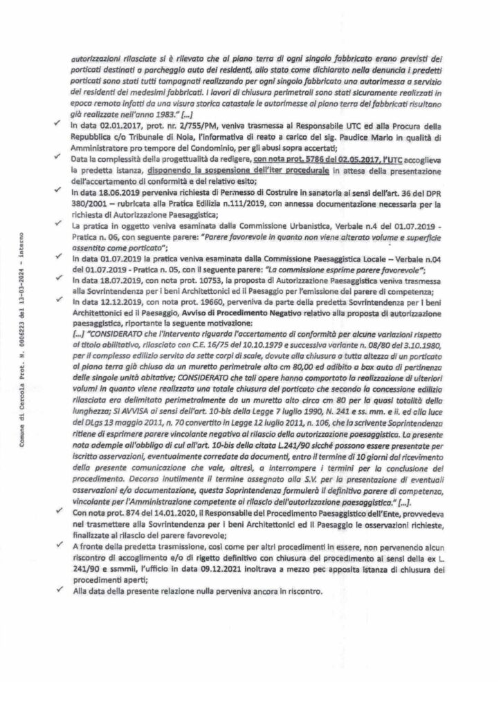 L’UTC EMETTE L’ORDINANZA DI ANNULLAMENTO DELLA SANZIONE DI 20.000€ A PAUDICE SU UN’INDICAZIONE DEL SEGRETARIO GENERALE. SANZIONE RIVOLTA A TUTTI I PROPRIETARI DEL PARCO EDILFUTURA. PERCHE’ QUESTI RITARDI? Un’altra riflessione va aperta sul perchè solo dopo il balletto sull’effettiva conclusione del procedimento urbanistico della richiesta – ribadiamo irregolare – di accertamento di conformità urbanistica ai garage del Parco Edilfutura, presentata all’epoca da quel condominio, si è passati ad individuare, molto tardivamente, a chi dovesse essere elevata la sanzione? Nel frattempo c’è stata l’eroica resistenza di Chiara Esposito, Comandante della Polizia Municipale, la quale ha respinto le note dell’UTC, sia del capo D’Alessandro che del responsabile della paesaggistica al comune Emanuele Capurso, il quale in stile Mauro Formisano 2017, comunicava alla Esposito in virtù del fatto che non fosse arrivata ancora la definitiva autorizzazione paesaggistica dai controllori napoletani il verbale di inottemperanza poteva essere sospeso. Corsi e brutti ricorsi storici che si rinnovano, ma stavolta, la Polizia Municipale non accetta e rinvia al mittente la fantasiosa richiesta di sospensione degli effetti del verbale di inottemperanza. Il segretario generale Valentina Santini investito da Lorenzo D’Alessandro per il suo ruolo di anticorruzione, oltre ad individuare i soggetti da sanzionare – tutti i proprietari dei garage – ha , probabilmente, approfondito le evidente irregolarità che hanno sospeso nel tempo – addirittura sette anni – la conclusione di questo procedimento che avrebbe dovuto avere la sua fine già nel 2017? Infatti, il condominio non fece ricorso al Tar Campania per la sospensione degli effetti dell’ordinanza 5/2017 e si agganciò ad un’incredibile richiesta di proroga dei termini degli effetti dell’ordinanza n.5/2017 che non ha fondamento giuridico e che il geometra Mauro Formisano, all’epoca dei fatti non responsabile di servizio, inviò alla Polizia Municipale annunciando la irregolare sospensione dell’ordinanza, oggi con nota inviata alla Polizia Municipale, anche l’ingegnere Emanuele Capurso, non essendo responsabile del servizio, ma un semplice responsabile di procedimento non dotato di nessun potere esterno all’ufficio, ha tentato il ‘colpaccio’ in stile provvedimento di Formisano, ottenendo, invece, il due di picche classico per la richiesta di sospensione o revoca del verbale degli effetti del verbale di inottemperanza
