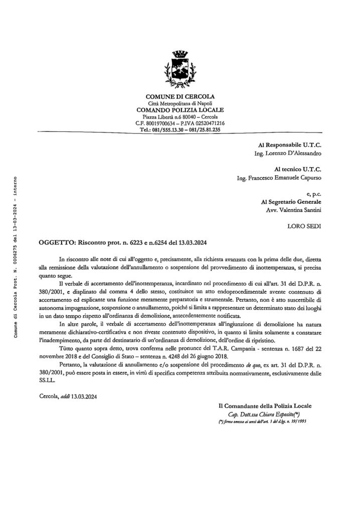 NOTA DEL COMANDANTE DELLA POLIZIA MUNICIPALE CHIARA ESPOSITO DI DINIEGO DELLA SOSPENSIONE DEGLI EFFETTI DEL VERBALE DI INOTTEMPERANZA RICHIESTO DALL’UTC. FARAGE ABUSIVI EDILFUTURA