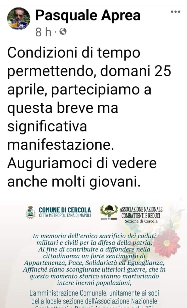 Cercola (Na) – La Festa delle Forze Armate del 4 novembre 2023 non fu celebrata dall’amministrazione comunale guidata dal sindaco Biagio Rossi, ma oggi, in pompa magna, però, si annuncia l’iniziativa della “Festa della Liberazione dal Nazifascismo” del 25 aprile: il sindaco Biagio Rossi ed Aldo Improta, presidente del circolo ( ormai divenuto circoletto ) dei Combattenti e Reduci hanno confezionato un manifesto politico fatto affiggere sui tabelloni istituzionali lungo le strade cittadine e pubblicati sui social, tanto di patrocino morale del comune di Cercola. Il chiaro intento politico, alimentato da “quelli del circoletto”, sarebbe questo: strumentalizzare, a fini politici, anche questa celebrazione,di proprietà della sinistra italiana, al fine di lanciare un segnale di ‘esistenza in vita’ ai delusi gruppi di sinistra che hanno sostenuto la proposta del cambiamento in città incarnata da Rossi in campagna elettorale, al momento chiusa a 23 mandate nel cassetto degli uffici al Municipio.