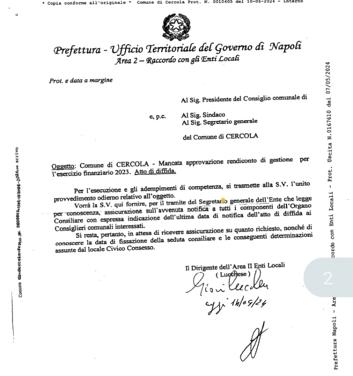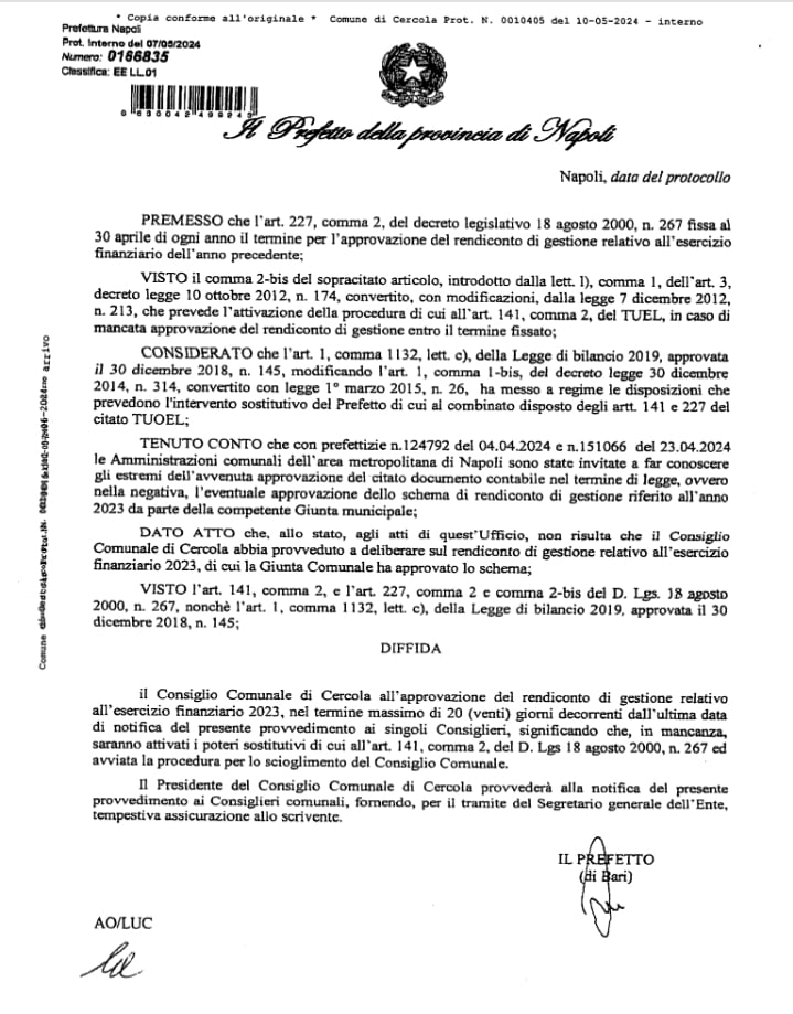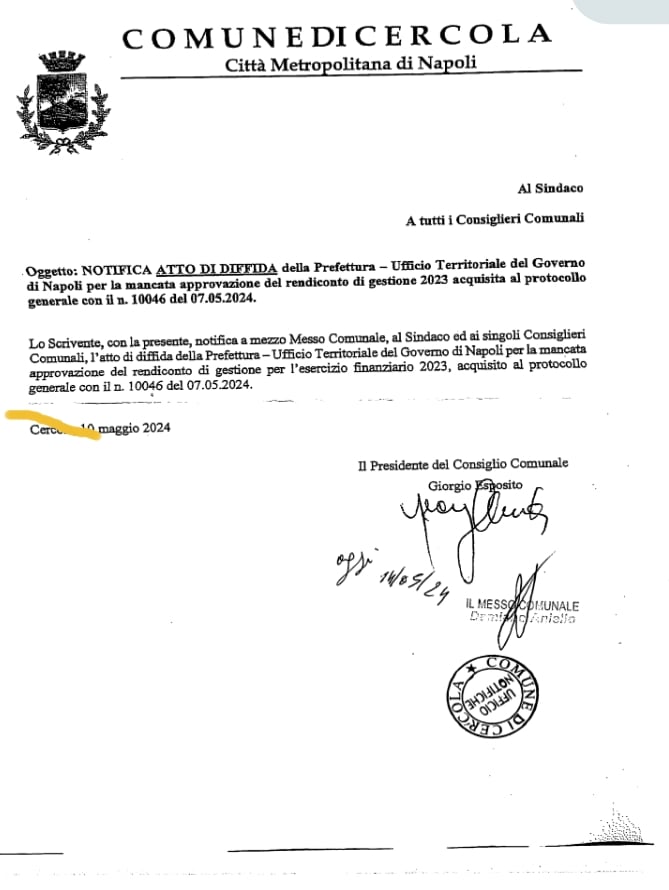 IL FATTO. LO SCORSO 7 MAGGIO LA PREFETTURA DI NAPOLI HA DIFFIDATO IL COMUNE DI CERCOLA AD APPROVARE ENTRO 20 GIORNI IL CONSUNTIVO IN CONSIGLIO COMUJNALE. Il prefetto di Napoli ha inviato il 7 maggio al comune di Cercola la diffida. perchè superato il termine perentorio del 30 aprile 2024, per l’ approvazione del rendiconto consuntivo si deve, invece, approvare in consioglio comunale entro 20 giorni dalla data della notifica all’ultimo consigliere comunale. Soltanto il 10 maggio, guarda caso, il presidente del consiglio comunale Giorgio Esposito arriva in comune ed emette la disposizione al messo di notificare ai rappresentanti consiliari l’importante documento della Prefettura di Napoli. Giorgio Esposito invia gli atti da notificare al messo comunale solo verso le 14, orario il cui il dipendente del comune esaurisce la sua giornata di lavoro. Quindi, il messo ha potuto iniziare a notificare soltanto il lunedì 14 maggio 2024. Una settimana dopo l’invio della diffida dall”ente prefettizio di Piazza del Plebiscito. In considerazione dell’urgenza Esposito avrebbe potuto disporre un orario straordinario al messo comunale, invece, ha desistito. Ricordiamo ai lettori che Giorgio Esposito percepisce, comunque, un’indennità di funzione pari a 2.200€ mensili per l’espletamento dell’incarico a garanzia di tutti i consiglieri comunali eletti dal popolo e non a creare scorciatoie per mascherare ritardi ed inadeguatezze dalla Giunta Municipale. Dal 14 maggio il messo comunale è alle prese con la folle rincorsa al consigliere comunale che fugge dalla notifica, siamo al 19 maggio e ne mancano 5, sapete perchè scappano? Probabilmente, da quanto trapela dal palazzo di città il collegio dei revisori dei conti avrebbe riferito di serie difficoltà ad emettere il parere al rendiconto , probabilmente, i controllori contabili sono stati colti da un’improvvisa voglia di legalità determinata(?) dall”indagine in corso della Direzione Distrettuale Antimafia al comune di Cercola. Il presidente del consiglio comunale Giorgio Esposito sta assumendo un comportamento istituzionale, probabilmente, di parte ed ha sgombrato il campo dai dubbi e le perplessità di chi mette in discussione le reali capacità politiche dello stesso rispetto all’assolvimento in modo imparziale le funzioni istituzionali. Esposito, in considerazione dei ritardi avvertiti dal collegio dei revisori dei conti, insieme ai consiglieri ‘fuggitivi’, tenta di rinviare nel tempo la notifica all’ultimo consigliere comunali, fatto che determina l’immediata convocazione del consiglio comunale da tenersi entro venti giorni al fine di approvare definitivamente il rendiconto consuntivo: invece, la città deve aspettare che si pronunciano i revisori con il parere. Il sindaco Rossi si dichiarò esperto di bilancio e i disastri commessi sono ormai fatto noto. Se tutto ciò non accade nei termini messi in diffida dalla Prefettura partirebbe la procedura di scioglimento del consiglio comunale attivata dal Prefetto di Napoli.