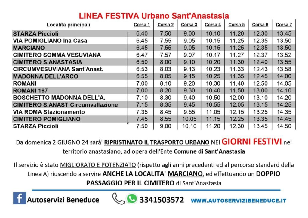 Sant’Anastasia (Na) – Da domenica scorsa è stato ripristinato, oltre che migliorato e potenziato, il trasporto urbano anche nei festivi: è stata servita anche la località periferica Marciano ed effettuato un doppio passaggio per il cimitero comunale.
