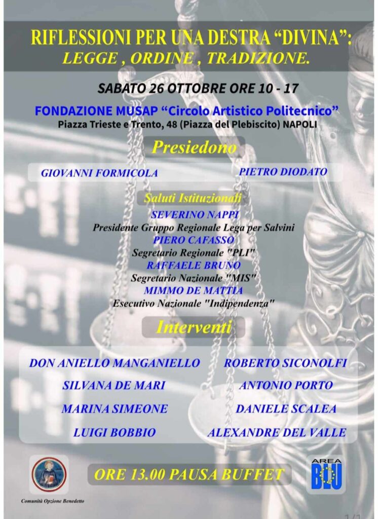 Napoli – Sabato 26 prossimo ottobre con inizio alle ore 10, avrà luogo a Napoli il convegno dal titolo “Riflessioni per una Destra “divina” – Legge, Ordine, Tradizione.” L’incontro, promosso dalle associazioni culturali Area Blu e Comunità Opzione Benedetto, ed al quale parteciperanno eminenti esponenti nazionali ed europei del pensiero “forte”, si terrà nella prestigiosa sala Comencini della Fondazione Musap – Circolo Artistico Politecnico a palazzo Zapata in piazza Trieste Trento, 48. L’obiettivo del confronto è quello di fare un “tagliando” all’attuale visione della Destra, nazionale ed europea, con un manifesto, frutto di un ampio contributo, che fissi le sue “colonne d’Ercole” sul piano dei valori, sull’attuale modello di società , sugli scenari europei ed internazionali, sulle prospettive generazionali e disagio giovanile, sulle migrazioni, i processi di denazionalizzazione in atto, ed altro ancora. Sicuramente ambizioso, ma le presenze sapranno essere all’altezza della sfida. Apriranno i lavori Pietro Diodato per Area Blu e Giovanni Formicola per Opzione Benedetto, seguiranno i saluti istituzionali del presidente del gruppo consiliare della Lega in regione Campania prof. Severino Nappi; di Mimmo De Mattia per il Movimento Indipendenza, del segretario nazionale del Mis Raffaele Bruno, del segretario regionale del PLI Piero Cafasso. A seguire gli interventi della professoressa e scrittrice Marina Simeone, di don Aniello Manganiello parroco di Scampia, del prof. Roberto Siconolfi, del Magistrato Luigi Bobbio, della scrittrice Silvana De Mari, del presidente del centro studi Machiavelli prof. Daniele Scalea, ed in collegamento dalla Francia, del prof. Alexandre Del Valle politologo e saggista, già membro del UMP (successivamente Les Republicains) di Juppe’, Sarkozy e Fillon.