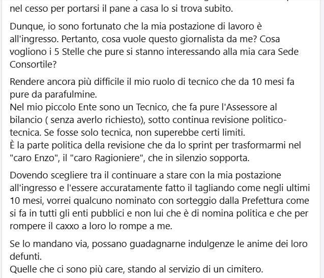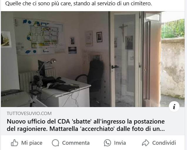 TUTTOVESUVIO HA RISPOSTO CON I FATTI ALLE ACCUSE DI STRUMETALIZZAZIONI MOSSE DA PISANO: PUBBLICATI GLI AUDIO INTEGRALI! Diversi mesi fa, Vincenzo Pisano ha contattato la nostra testata giornalistica, via mail, lasciando il suo recapito telefonico, diverse settimane dopo fu chiamato e ci raccontò delle critiche situazioni amministrative, a nostro avviso condivisibili, rispetto alla sua postazione messa all’ingresso della sede cimiteriale ubicata al palazzo municipale di Cercola, parlandoci anche della presenza ingombrante dell’ufficio del consiglio d’amministrazione del consorzio cimiteriale, mai previsto finora, nel luogo di ricevimento al pubblico dei responsabili incaricati della gestione amministrative delle pratiche cimiteriali. Vincenzo Pisano, dimostrabile degli audio integrali, ha condiviso anche la nostra inchiesta sul mancato rimborso di quasi 600€ a testa per i 120 concessionari dei loculi costruito in autofinanziamento al cimitero di Massa di Massa di Somma. Dopo aver avuto sereni e costruttivi contatti telefonici con la nostra testata giornalistica all'improvviso ci sferra un insolito e gratuito attacco pubblico, indirizzato allo scrivente direttore responsabile del giornale hosting.maya.it/, accusandoci di strumentalizzare la sua condizione professionale riscontrabile dalla pubblicazione di un suo post dalla sua pagina Enzo Pisano di facebook che contestava il nostro articolo, allegato allo stesso post, scrivendo testualmente; ” Un mese fa qualcuno si è accorto che io esisto. Naturalmente per usare il mio caso per attaccare i suoi avversari politici . Come si dice? Sono andato in Paradiso per scambio. Che bello! Avrò pensato tra l’altro che senza che io avessi richiesto alcun aiuto per la difficile situazione oggetiva un cui svollgo ogni giorno dignitosamente il mio lavoro, ma ciò che era stato pubblicato non era veramente per aiutarmi. Sospetti frutto di opinioni personali di scriveva sono in quest’articolo spacciati per prove oggettive di misfatti che esistono solo nell’onanismo metafisico di un romanziere che si umilia facendo il cronista locale. Credeva di aver trovato la vittima del sistema, pronta a svelarne i segreti, che sarebbero naturalmente combaciati con l’onanismo metafisico (masturbazione mentali n.d.r.) sopracitato..” Un attacco pieno di offese gratuite sia sul piano personale che su quello professionale che vanno contrastate con i fatti: ovvero la pubblicazione a fine articolo di alcuni degli audio che Pisano ha inviato sulla utenza telefonica whatsapp del direttore responsabile che a poche ore dall’invio lo stesso Pisano cancellava, ma erano già state spostati nel nostro archivio, l’esperienza conta anche un pochetto. Quindi, questo attacco gratuito di Vincenzo Pisano sarà stato sferrato consapevole di aver cancellato le tracce, gli è andata male. Inoltre, come si evince dagli audio e contrariamente a quanto sostiene Pisano dal post di facebook che non ha chiesto aiuto al giornale, nei fatti, invece, lui non solo espone la legittima questione del posizionamento della sua postazione, ribadiamo condivisibile, ma chiede anche di far uscire la sua figura come una vittima perchè non avrebbe mai contestato tale condizione, e, infatti, tale insolita richiesta non è stata accolta. In merito alla sua offesa gratuita che chi scrive è affetto da onanismo metafisico( masturbazione mentale) in quanto erano sospetti privi di ogni prova si è smentito da solo, basta ascoltare i suoi audio integrali che tratteggia in modo inquietante le attività nel consorzio cimiteriale andando oltre le nostre peggiori critiche contenute negli articoli scritti nel passato.