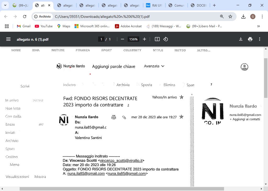 LA CONTROVERSA MAIL SCOTTI/ILARDO CONTERREBBE PROPOSTA DI SCOTTI SUL FONDO PERSONALE, SI IPOTIZEREBBE DAL DOSSIER SANTINI. Il segretario generale Valentina Santini ricevette alle ore 19,27 del 27 dicembre 2023 sulla sua casella di posta ordinaria santini.valentina@yahoo.it un inoltro di messaggio di posta elettronica da parte della casella sempre di posta ordinaria nuna.ila85@gmail.com, intestata ad Annunziata Ilardo, assessore alla legalità e personale in carica, come si deduce dal curriculum dei candidati al consiglio comunale presentato al municipio in occasione della competizione elettorale comunale e pubblicato nella sezione elezioni trasparenti del sito ufficiale del comune di Cercola, infatti, Annunziata Ilardo fu candidata non eletta per la lista Liberi e Forti. Da questo inoltro di messaggio si aggancia il messaggio – datato 20 dicembre 2023 – che inviò Vincenzo Scotti dalla casella Vincenzo_Scotti@virgilio.it , utenza che sarebbe in uso dallo Scotti da una ventina di anni, alla stessa Ilardo contenente un allegato word utilizzato per un sorta di conteggi per il calcolo del fondo decentrato da destinare al personale del comune di Cercola. Come sosterrà, sempre nel suo Dossier Valentina Santini, tali conteggi potrebbero essere stati utilizzati per la proposta della giunta municipale relativamente al provvedimento da adottare.