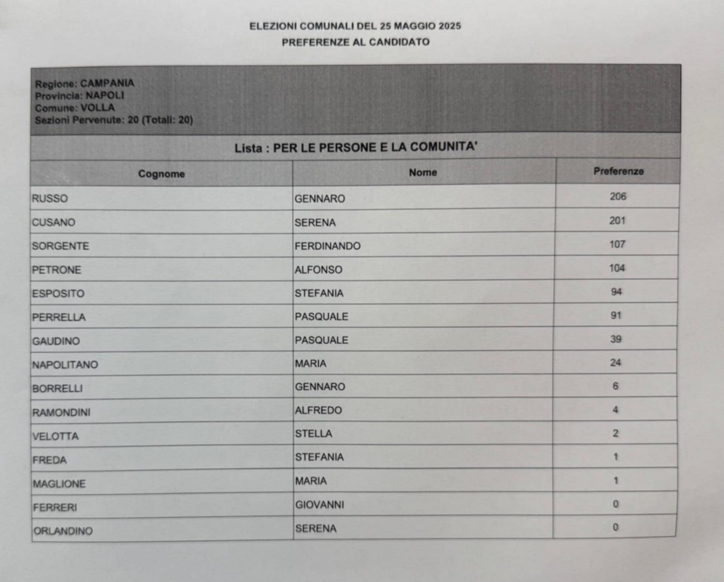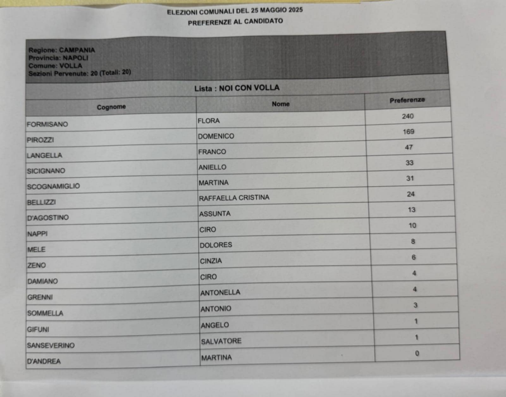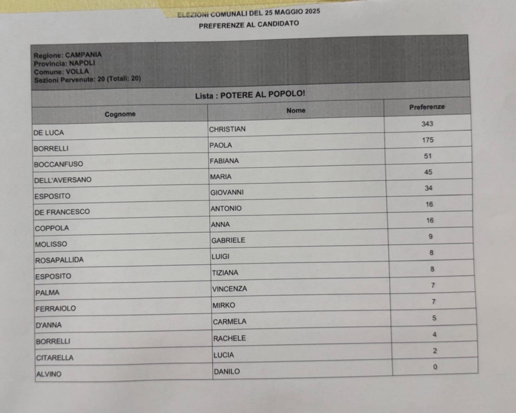 Volla. Tutte le preferenze dei candidati al consiglio comunale di La Mia Volla, Potere al Popolo, Per le Persone e la Comunità e Noi con Volla
