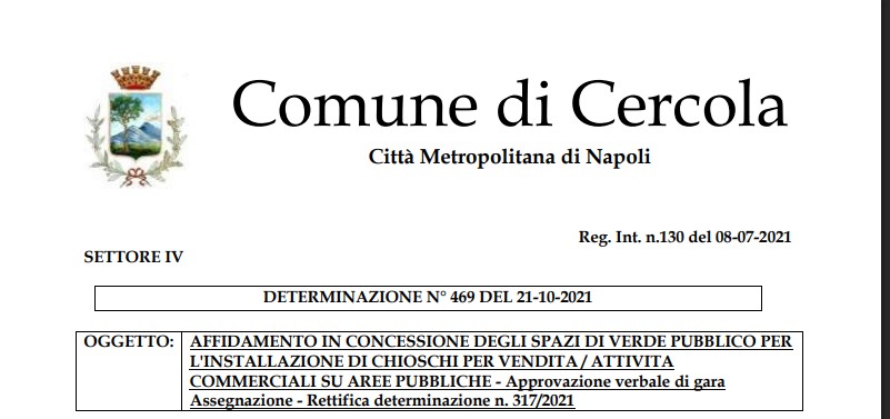 Lo spazio pubblico di viale delle Palme/Masseria Carafa se lo aggiudica la signora Valentina Di Costanzo e non Scintilla s.r.l. Il comune di Cercola nel lontano 3 febbraio 2021 pubblicò l’avviso pubblico “per la concessione su aree pubbliche per la installazione di chioschi vendita e per attività commerciali”, 29 aprile 2021 fu il termine fissato per depositare le istanze di partecipazione. Su decine di spazi di aree pubbliche del comune di Cercola messi a bando al municipio arrivarono solo tre proposte, in seguito aggiudicate, per tre diversi spazi pubblici, uno dei quali, era quello di viale delle Palme/Masseria Carafa. Con determina dirigenziale n. 469 del 21 ottobre 2021, approvata dal capo dell’ufficio tecnico del Comune Lorenzo D’Alessandro, tale area viene aggiudicata dalla signora Valentina Di Costanzo, quindi non dalla società Scintilla s.r.l., costituita soltanto nel maggio 2024, il cui amministratore unico è Lucia Mazzone, conosciuta in città come Luciana, anche candidata al consiglio comunale nel 2023 – non eletta – nella lista “PER le Persone e la Comunità”, a sostegno dell’attuale sindaco Biagio Rossi. Valentina Di Costanzo, invece, entra a far parte di questa società con un ruolo marginale, detiene soltanto il 10% delle quote della Scintilla s.r.l.