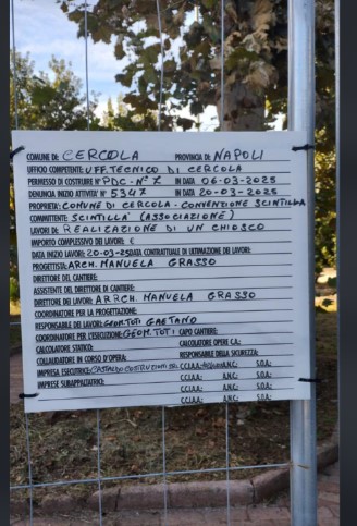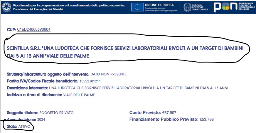 Spunta un finanziamento PNRR di 52,798€, ancora attivo, alla Scintilla s.r.l. per l’installazione di chiosco e pergotenda proprio su viale delle Palme. Durante la nostra ricerca e analizzando i documenti pubblici riguardanti questo intervento edilizio sull’area comunale di viale delle Palme/Masseria Carafa abbiamo recuperato la notizia di un finanziamento PNRR, ancora attivo, richiesto dalla Scintilla s.r.l. e ottenuto nel 2024 per ‘Una ludoteca che fornisce servizio laboratoriali rivolto ad un target di bambini dai 5 ai 13 anni.” L’area di intervento risulta essere quella di Cercola in viale delle Palme. Quindi, la Scintilla s.r.l. richiede e ottiene un finanziamento di € 53.798€ del Governo nazionale su un’area comunale dove non risulterebbe assegnataria e l’ente proprietario, il comune di Cercola, non avrebbe pubblicato alcun provvedimento di autorizzazione al finanziamento o collegati. Sempre relativamente a questo finanziamento, ribadiamo ancora attivo, dal cartello apposto sul cantiere, sembra da pochi giorni nonostante l’inizio dei lavori è datato marzo 2025, compare che il permesso a costruire n. 7/2025 sia stato rilasciato all’associazione di promozione sociale Scintilla e non alla società commerciale Scintilla s.r.l., tantomeno a Valentina Di Costanzo. Inoltre, non si nota nel cartello dei lavori al cantiere che l’intervento sarebbe finanziato anche dai fondi PNRR : perchè? E’ cambiato qualcosa?