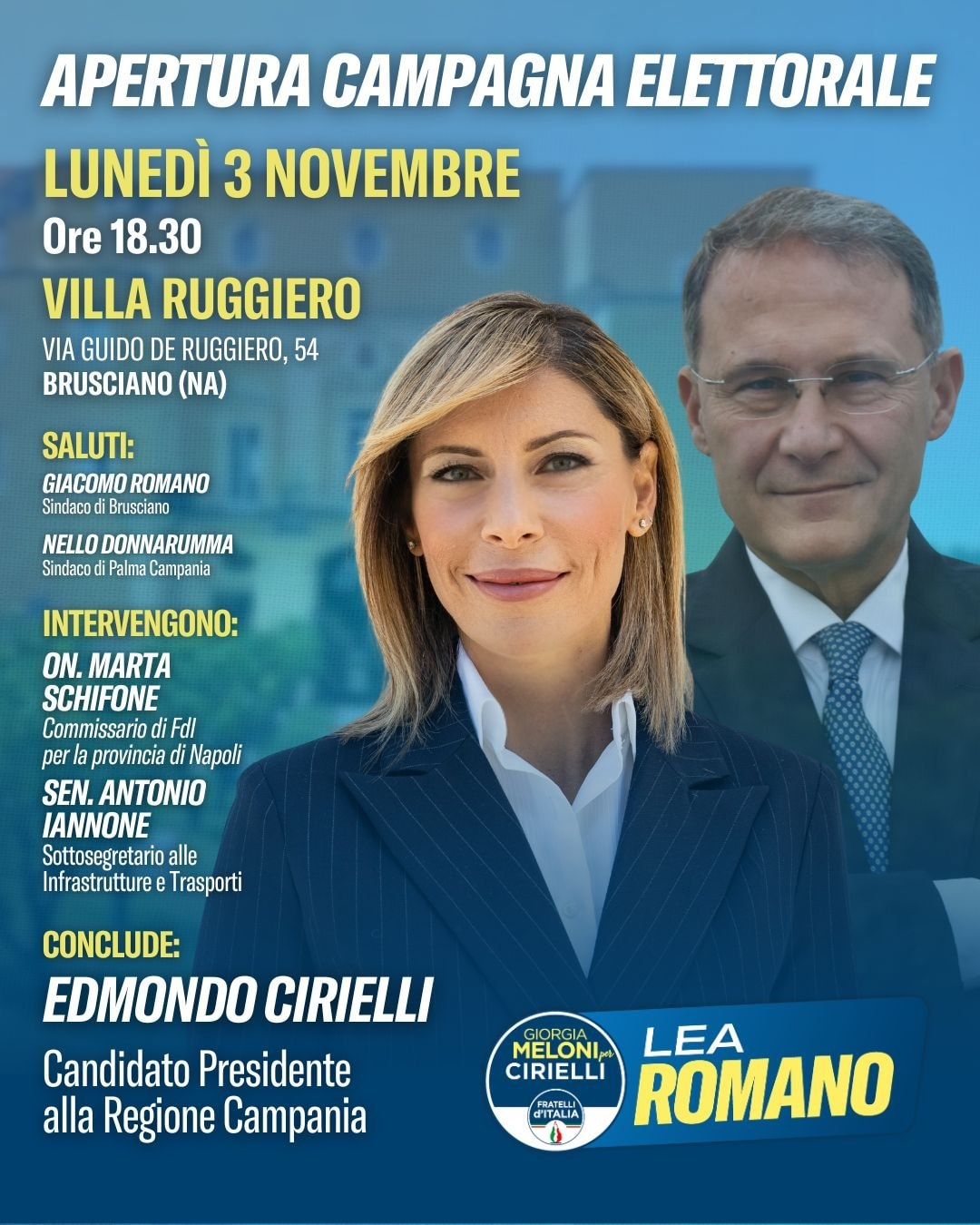 Attesissimo l’intervento del viceministro agli esteri Edmondo Cirielli, candidato alla Presidenza della Regione Campania. Sarà in quel di Brusciano anche il sottosegretario al Ministero delle Infrastrutture e Trasporti Antonio Iannone e il deputato Marta Schifone, fresca di nomina a capo della Federazione Provinciale di Fratelli d’Italia per i circoli dell’area metropolitana di Napoli. Due sindaci del nolano faranno gli onori di casa per il parterre di ottima qualità politica messo in campo dall’organizzazione elettorale di Lea Romano, infatti, sono previsti i saluti istituzionali sia di Giacomo Romano , sindaco di Brusciano, e del sindaco di Palma Campania Aniello Donnarumma. Attesi a Villa Ruggiero un folto schieramento di politici e amministratori locali che arriveranno da Napoli e dai comuni di tutta l’area metropolitana che hanno condiviso la scelta di rinnovare il partito e le istituzioni regionali puntando su un prospetto politico, quale Lea Romano, dotata di grande qualità politica umana e professionale.