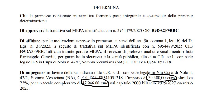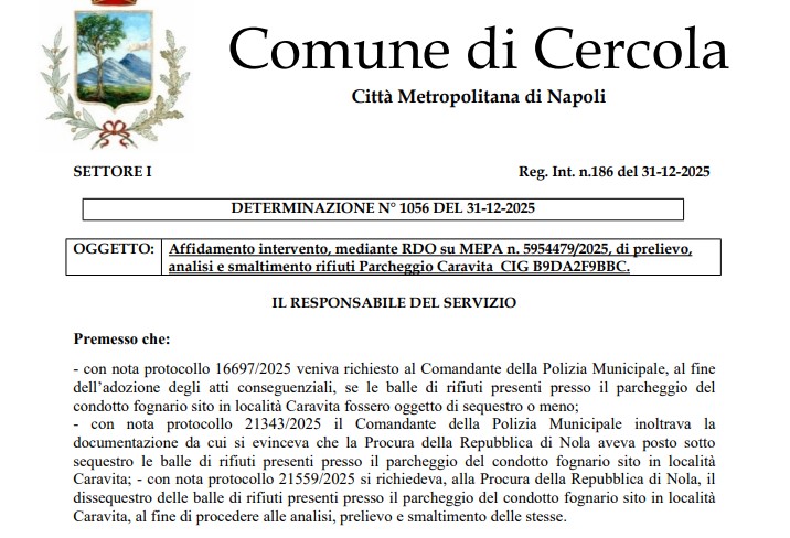 Cercola (Na) – Il comune di Cercola ha speso 47,946€ dei contribuenti al fine di smaltire 8 balle di rifiuti abbandonate nel parcheggio comunale della Cittadella Sportiva di Caravita: ecco quanto dispone la determina dirigenziale n. 1056 del 31 dicembre 2025 approvata da Nicola Boccia, funzionario all’ecologia dell’ente di Piazza della Libertà. Il provvedimento amministrativo che ha previsto analisi (?) prelievo (?) e smaltimento dei rifiuti in questione pone delle importanti, a tratti inquietanti, riflessioni rispetto alla spesa inferta alle casse comunali di 47.946€: costo del servizio relativo all’intervento di sanificazione ambientale affidato direttamente alla C.R. di Somma Vesuviana, impresa proveniente dallo stesso comune dove il funzionario risulta essere di ruolo in quel Municipio.