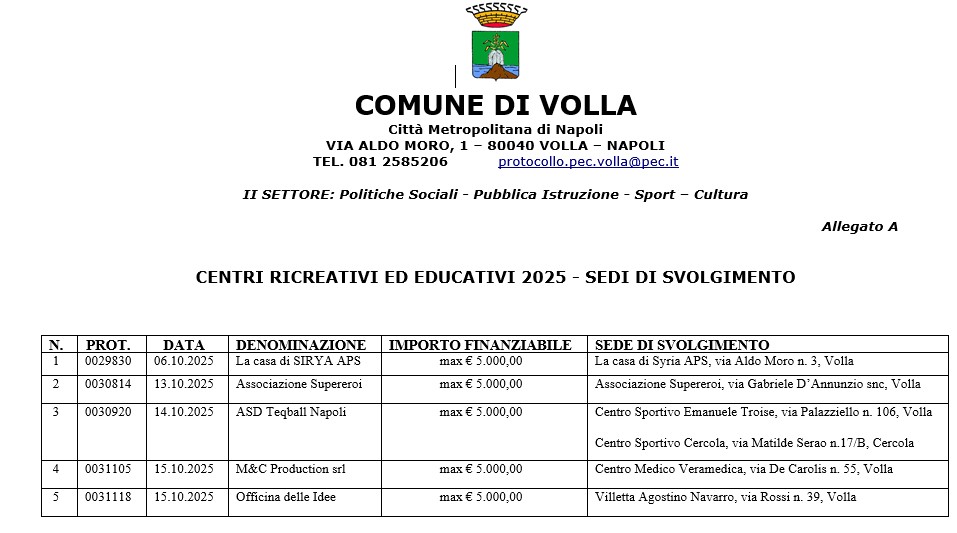 L’associazione sportiva Teqball Napoli con sede legale in Casalnuovo di Napoli ha dichiarato come sede di svolgimento delle attività ricreative il centro sportivo di Cercola in via Matilde Serao. Da una nostra ricostruzione documentale, accompagnata da testimonianze accreditate, sembrerebbe che l’uso della struttura comunale di Cercola l’avrebbe ‘contratta’ dal 29 settembre 2025, soltanto per due ore giornaliere per due giorni a settimana. Quindi, notiamo che l’avviso pubblico è datato 26 settembre 2025 e la relativa pubblicazione dello stesso all’albo pretorio on line del sito ufficiale del comune di Volla è del 30 settembre 2025. Quindi, per intenderci: l’uso del campo sportivo di Cercola lo avrebbe ‘contratto’ un giorno prima della pubblicazione del bando – datato 30 settembre 2025 – , operazione da ‘profeti’ del terzo millennio. Ricordiamo ai nostri lettori tra gli ammessi a partecipare a tale avviso pubblico non si includevano le associazioni sportive, fatto che ha impedito a tante realtà sportive del territorio di non partecipare, creando di fatto una presunta corsia preferenziale a chi, invece, ha partecipato lo stesso nonostante il bando era stato chiaro. Infatti, l’avviso pubblico disponeva la partecipazione ai soli Soggetti del Terzo Settore e le strutture pubbliche e/o private erogatrici di servizi educativi